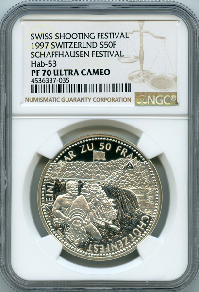 スイス シャフハウゼン 現代射撃祭 1997年 50フラン 銀貨 NGC PF70UCAM