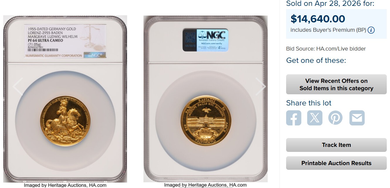 2026年4月に開催されたオークションでは、同グレードのコインが、”14,640ドル”(手数料込)で落札されています。