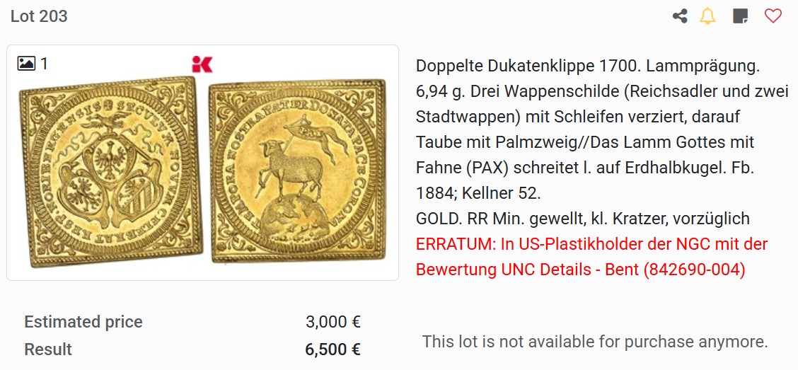 直近では、2026年1月開催のオークションに出品されていた”UNC DETAILSのBENT”が”6,500”ユーロで落札されています。