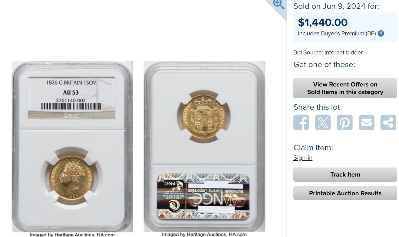イギリス ジョージ4世 1826年 ソブリン 金貨 NGC AU55